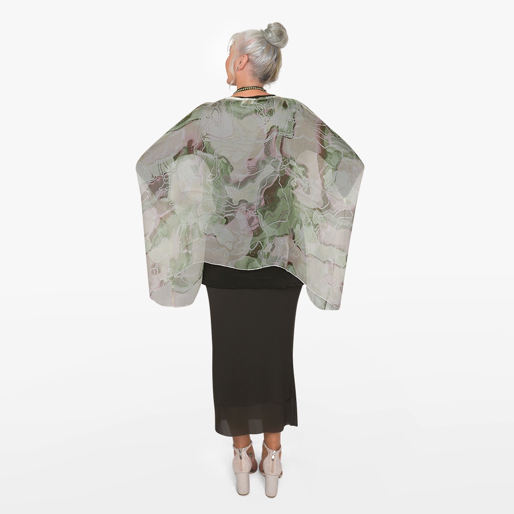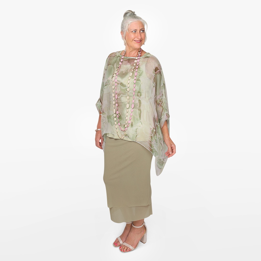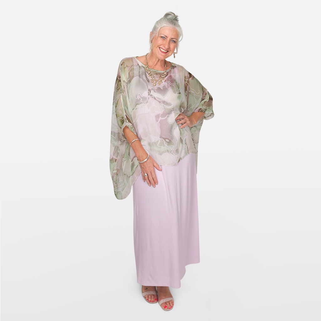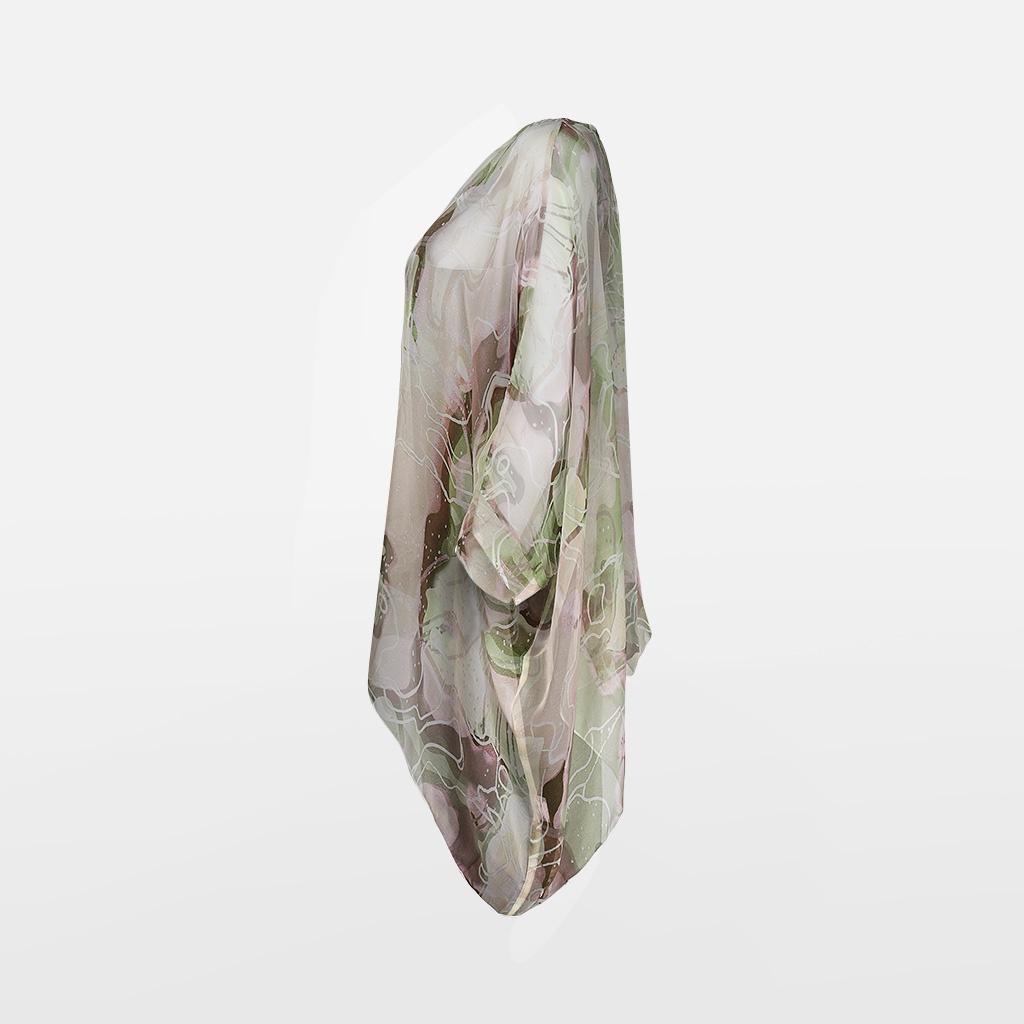 She is a variation of a traditional silk kaftan, which is a timeless style that has the ability to elevate your outfit to the next level. The sheer nature of the silk chiffon allows the voluminous, billowing silk to simply smudge the shapely underlayer silhouette, otherwise, it would just be a tent! The weave of this silk means it is lightweight and breathable.