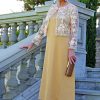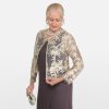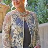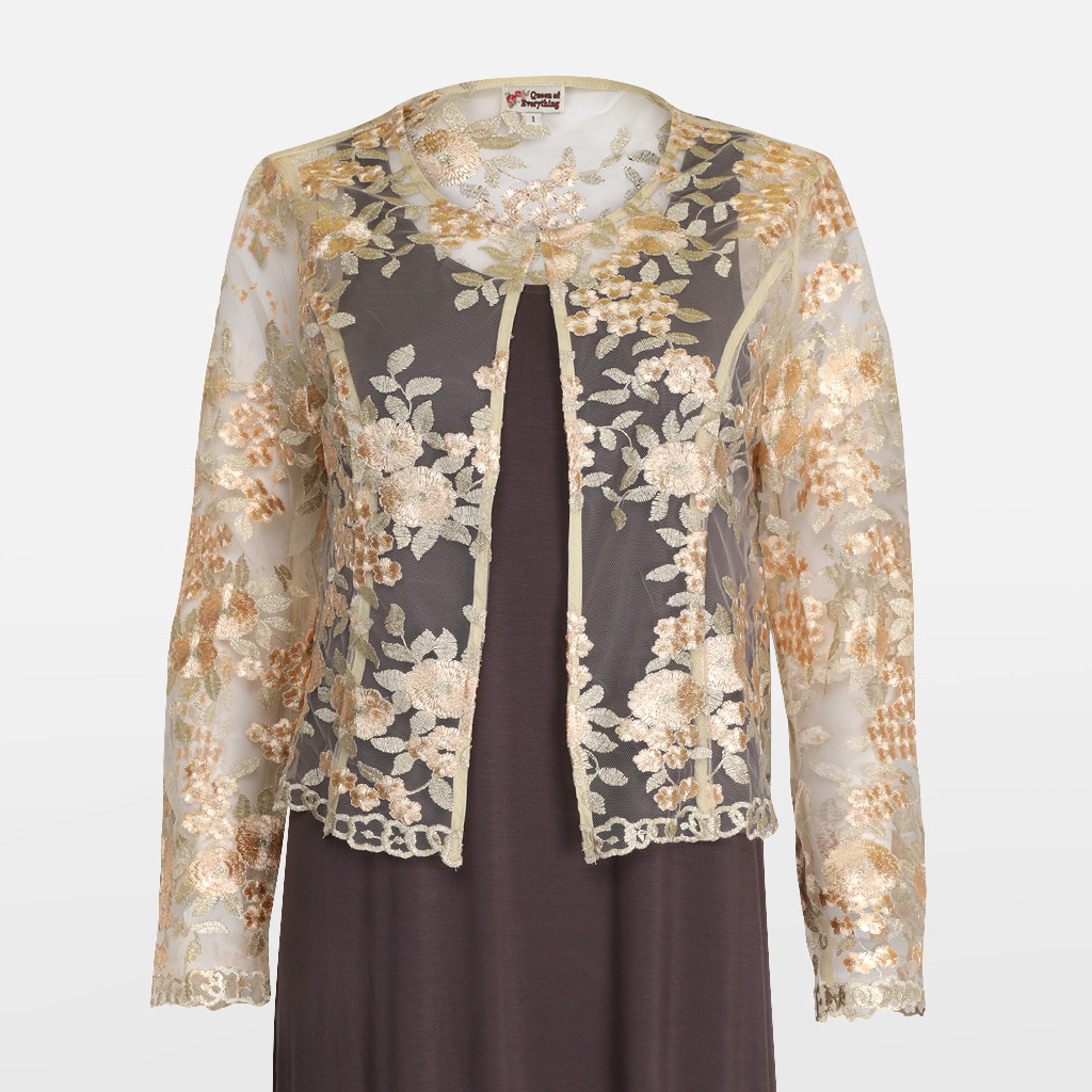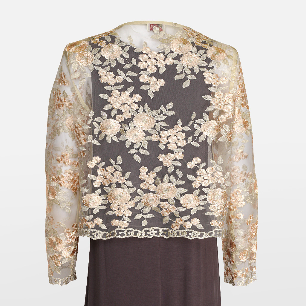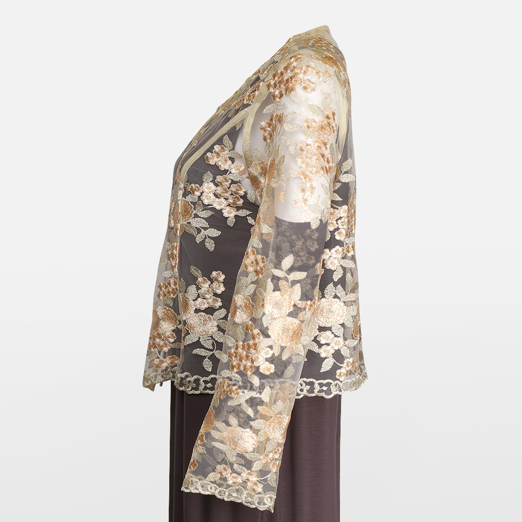 This beautiful piece features exquisite seam lines with a camel binding that adds a touch of structure. The jacket is adorned with delicate flower clusters, creating a charming and feminine look.