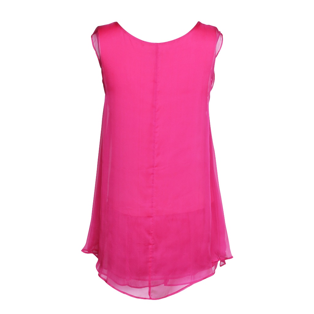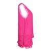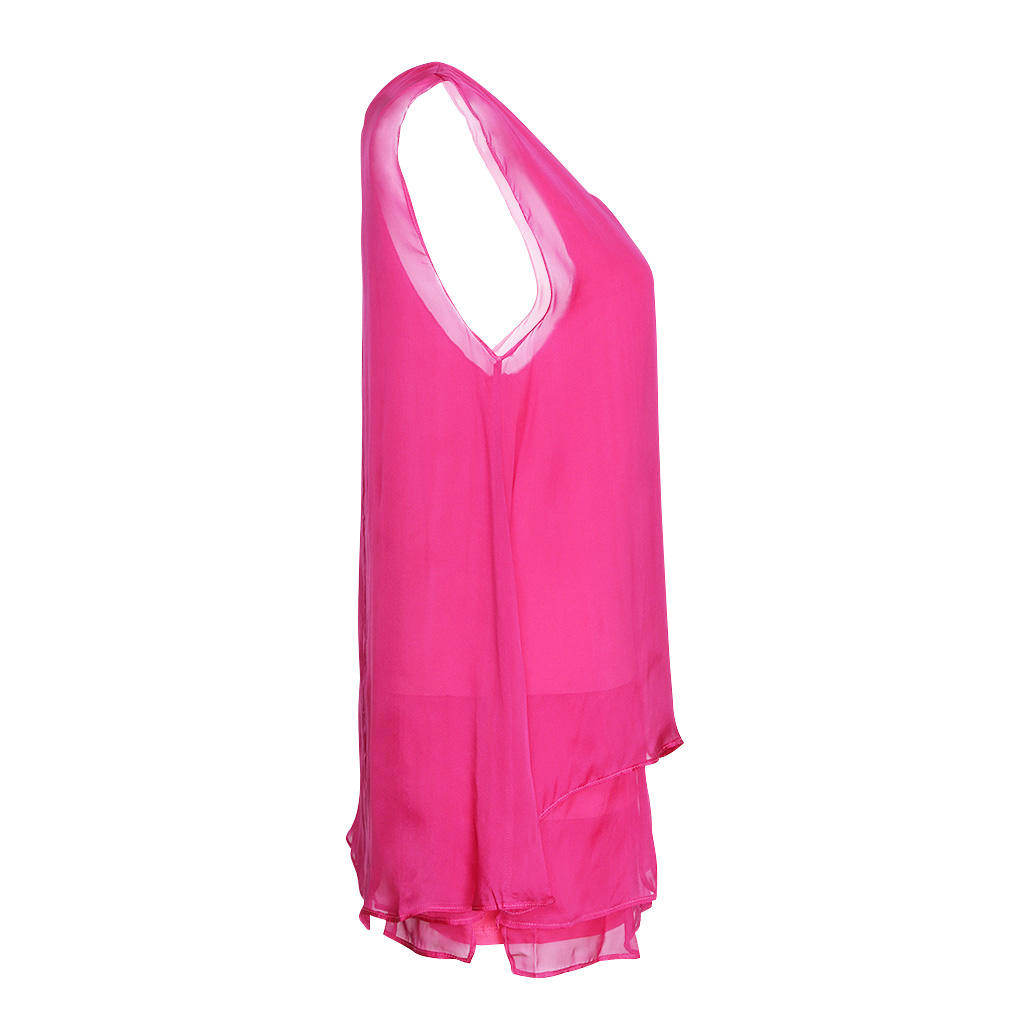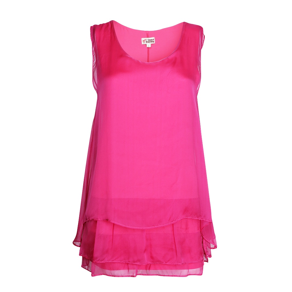 The Hot Pink Silk Amelia Tank has three sheer tiered layers, which cascade softly down the body. It lends itself perfectly to both athletic figures and those of us who lost our waist years ago. Like many of our styles, they are a bit longer to cover the hips, bum and tum.