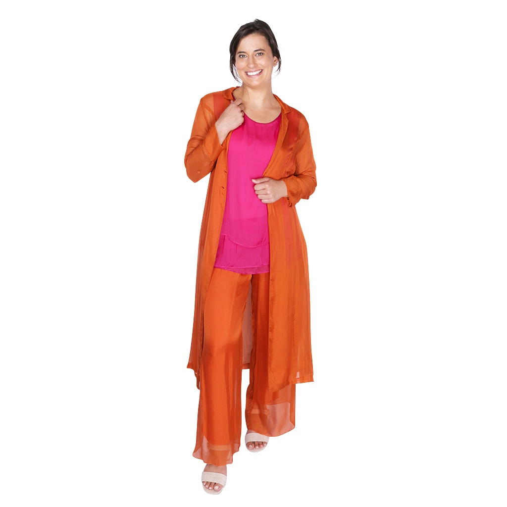 The weave of this silk means it is lightweight and breathable, making the Hot Pink Silk Amelia Tank the perfect tank for summer. Pair it with our Ochre Silk Pants for a colourful outfit, and finish up with the Red or Ochre Duster Coat.