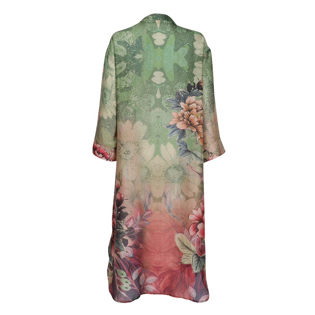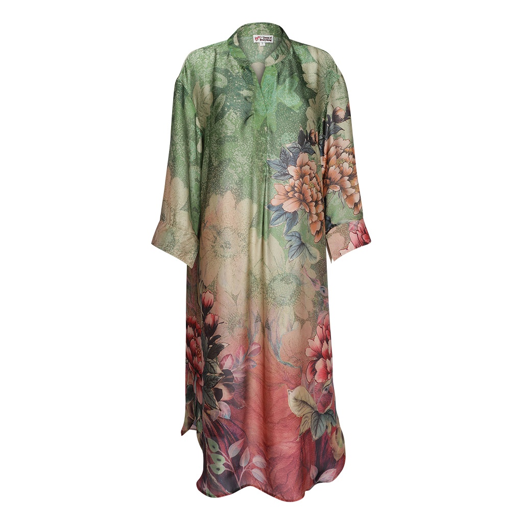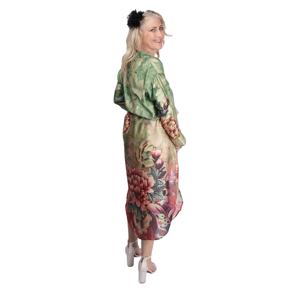 This amazing print is quite simply, wearable art. It’s a really lovely drawing of stylized chrysanthemums with buds and leaves in myriad colours.