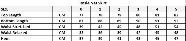 Rosie Net Skirt Size Chart