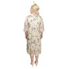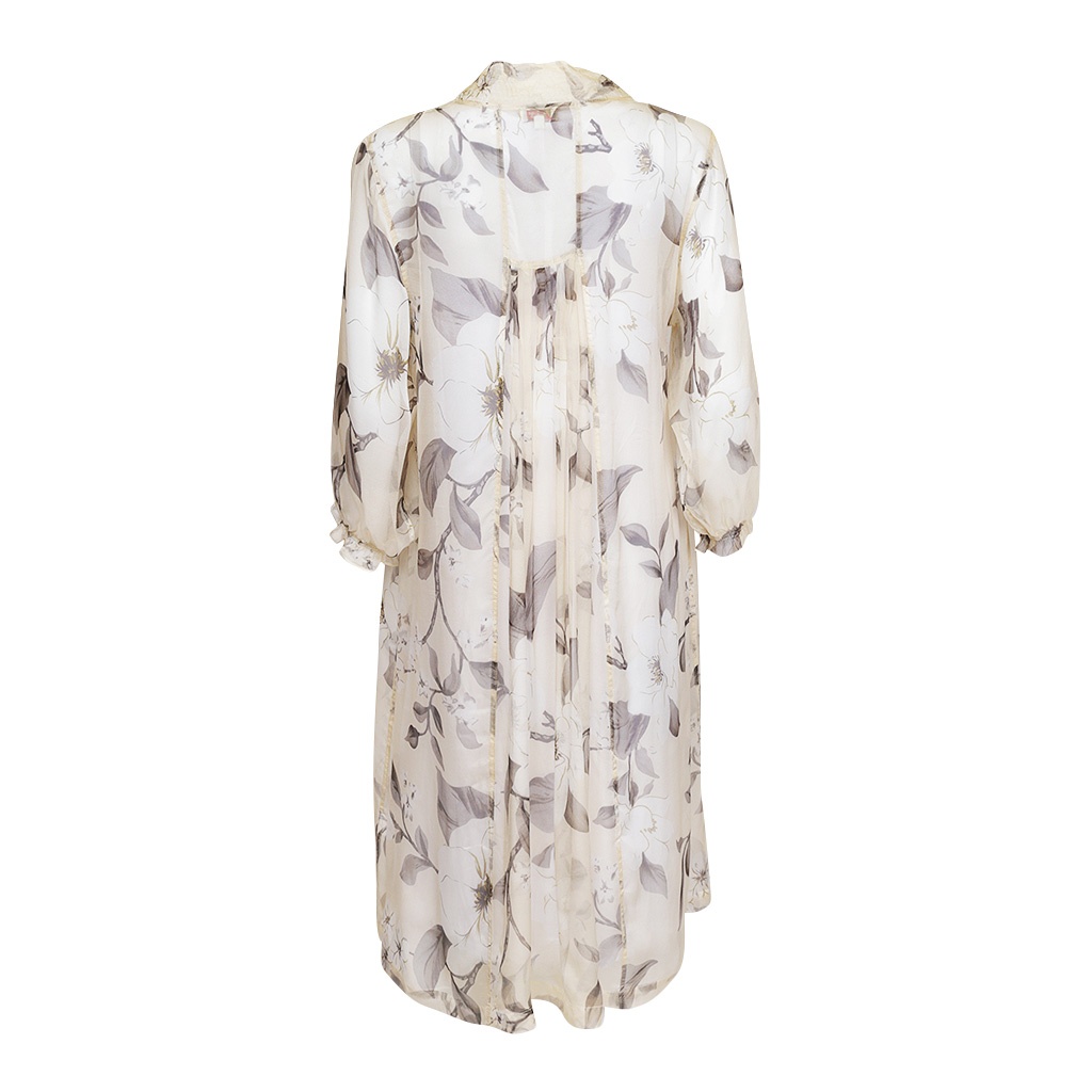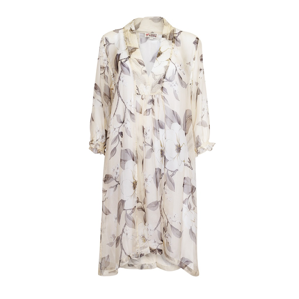 This flattering ¾ sleeve dress made in exquisite, sheer 100% silk chiffon has a slight gathering at the bust that cascades to the hem which along with the flattering V-neck, which breaks up the bust, creates a perfect silhouette. The elegant print of sprays of magnolia in white, silver, stone and charcoal on an ivory background makes for an easy transition from summer to winter, and day to night. So whether you dress her up or down you will love her versatility.